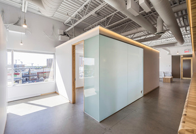 Le travail de la lumière, ingrédient essentiel à de nombreux traitements en dermatologie, est le point de départ du projet. Malgré les grandes fenêtres s’ouvrant à l’est sur le boulevard de l’Avenir et au sud sur le stationnement de la station de métro Montmorency, l’ancienne clinique médicale pédiatrique qui occupait ce local, était sombre et triste. L’implantation de la salle d’attente au centre avec des salles d’examen aveugles en périphérie déconnectait le public de l’extérieur avec ses vues et sa lumière naturelle. Afin de profiter des grandes ouvertures, l’ensemble du local a été traité comme un plan libre dans lequel sont venues se greffer les différentes fonctions de la clinique sous formes d’objets transparents, filtrant la lumière naturelle abondante en périphérie. Le plafond, entièrement tapissé de tuiles acoustiques, a été dégarni pour dilater l’espace.