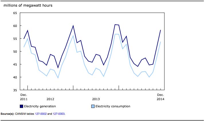 Le Canada a consommé 53,8 millions de mégawattheures (MWh) d’électricité en décembre, soit 5,1 % de moins qu’au même mois en 2013. Cette baisse était attribuable à des températures supérieures à la moyenne au Québec. Parallèlement à la demande, la production d’électricité au Canada a diminué de 3,4 % d’une année à l’autre pour s’établir à 58,3 millions de MWh. Les exportations vers les États-Unis se sont chiffrées à 5,4 millions de MWh en décembre, en hausse de 12,0 % comparativement à l’année précédente, tandis que les importations ont perdu plus du quart de leur volume pour s’établir à 0,8 million de MWh.