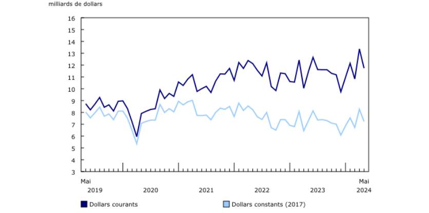 En dollars constants (2017 = 100), la valeur mensuelle totale des permis de bâtir a diminué de 12,5 % en mai, après avoir augmenté de 23,0 % en avril.
