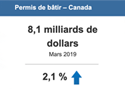 En mars, la valeur des permis de bâtir délivrés par les municipalités canadiennes s’est établie à 8,1 milliards de dollars, en hausse de 2,1 % par rapport à février. Cette hausse était attribuable à l’accroissement des intentions de construction dans l’Ouest canadien.