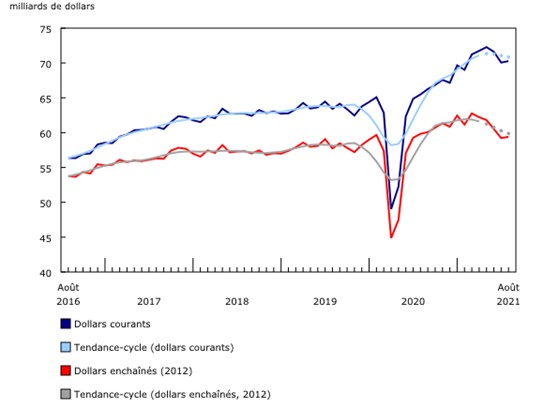 Les ventes de machines, de matériel et de fournitures ont enregistré une baisse de 1,7 % en août pour s’établir à 14,4 milliards de dollars; il s’agit de leur troisième recul en quatre mois et de leur niveau mensuel le plus bas en 2021. La baisse a été le résultat des ventes plus faibles de machines et de matériel pour l’agriculture, l’entretien des pelouses et le jardinage.