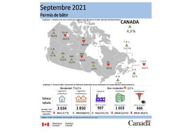 La valeur totale des permis de bâtir a enregistré un deuxième recul trimestriel consécutif, en baisse de 3,8 % au troisième trimestre par rapport au trimestre précédent pour s’établir à 29,8 milliards de dollars. Toutefois, la valeur des permis de bâtir était supérieure de 14,3 % à celle du troisième trimestre de 2020.