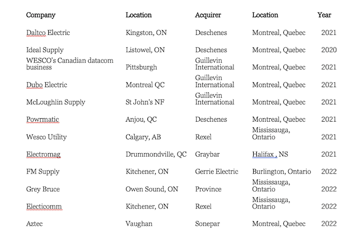 Au cours des 24 derniers mois, Guillevin, Graybar, Deschenes, Gerrie, Province et Rexel ont ouvert la voie en achetant de nombreuses marques.