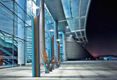La série propose notamment des luminaires, des colonnes lumineuses et des bollards aux fûts galbés.