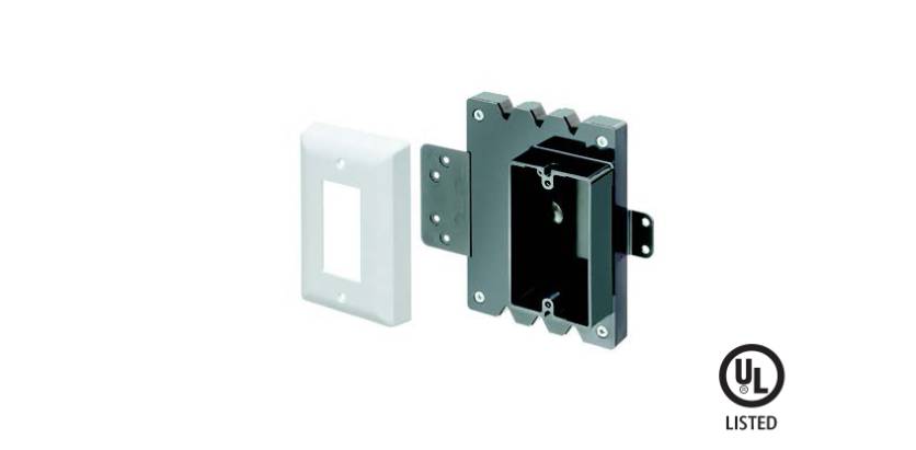 La boîte murale fourrée d’Arlington, répertoriée UL et de grand volume, se monte sur des bandes de fourrure pour cloisons sèches 1×2 — ou sur un mur en blocs de béton entre les bandes de fourrure. Permet aux installateurs de placer une boîte/prise là où ils le souhaitent.