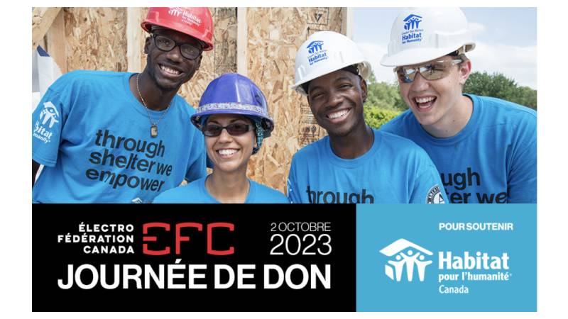 Dans le cadre de la Journée mondiale de l’habitat, qui aura lieu le 2 octobre 2023, les membres de l’Électro-Fédération Canada et leurs partenaires commerciaux s’unissent pour la troisième édition de la Journée annuelle du don de l’ÉFC en soutien à Habitat pour l’humanité Canada. Ensemble, nous aidons des familles à acquérir de la force, de la stabilité et de l’indépendance grâce à l’accès à un logement abordable.