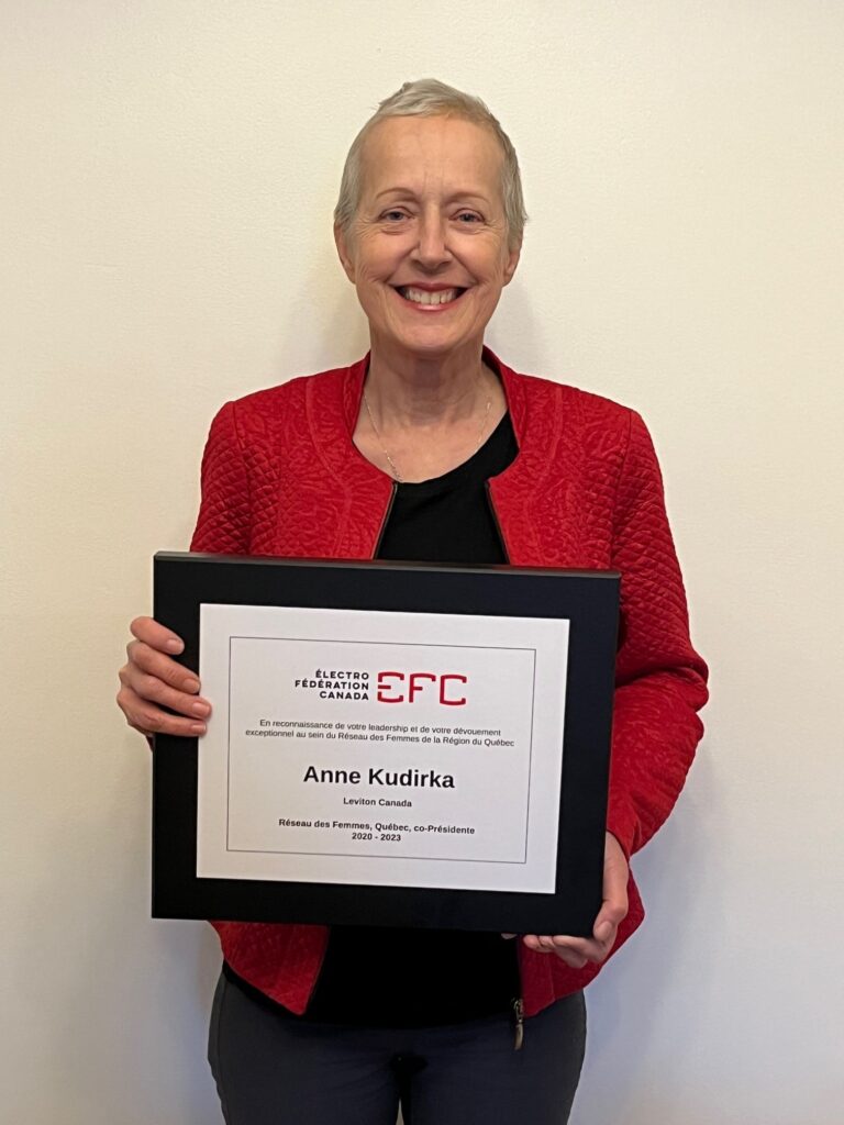 Aussi, un grand merci à Sylvie Comeau, Franklin Empire, et Anne Kudirka, Leviton pour tout l’engagement et le dévouement que vous avez apporté au comité à titre de coprésidente au cours des deux dernières années, Le comité des femmes à été créer au meme moment que la pandémie fut annoncée, ce n’était pas des années faciles et pourtant Sylvie et Anne ont réussi à faire grandir le réseau des femmes de la région du Québec malgré tout. Vous avez joué un rôle clef à l’avancement de ce comité et l’EFC de la région du Québec ainsi que toutes les femmes de l’industrie québécoise vous en sont reconnaissantes.
