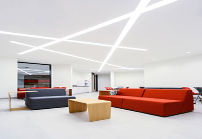 Dans l’entrée et la salle de repos, l’ambiance se décontracte et on assiste à une mise en scène dynamique des bandes fluorescentes encastrées au plafond, disposées de manière aléatoire et en croisement. Chaque angle de croisement d’une section à l’autre a été exécuté avec soin pour une continuité nette et précise de l’éclairage. Cette attention aux détails et cette mise en scène sur mesure concède au projet son caractère unique et léché. Ce jeu lumineux est également la vedette du salon étudiant, en correspondance avec l’irrégularité des murs pour une atmosphère dégourdie et ludique.
