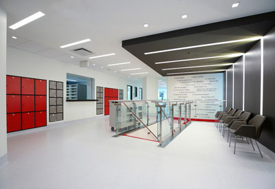 Au rez-de-chaussée, dès l’entrée des étudiants et des patients, on découvre un comptoir de réception noir qui contraste avec en arrière-plan un mur de verre et son éclairage diffus intégré. Le luminaire blanc suspendu aux arrêtes franches ajoute au concept minimaliste de l’espace.