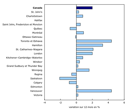 D’autres hausses prononcées ont été observées à Hamilton (+3,3 %), à St. Catharines–Niagara (+2,1 %), à London (+2,0 %) et à Windsor (+0,4 %). Il s’agit de la plus forte augmentation d’une année à l’autre à Windsor depuis janvier 2015.