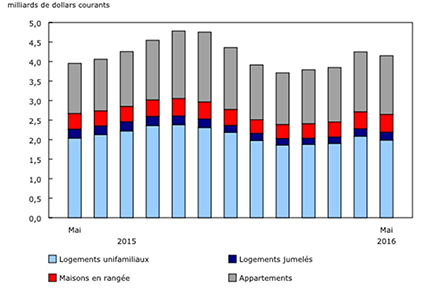 En revanche, l’investissement dans les logements unifamiliaux a reculé de 2,6 % par rapport à mai 2015 pour atteindre 2,0 milliards de dollars, tandis que les dépenses liées à la construction de logements jumelés ont diminué de 10,7 % pour se fixer à 206 millions de dollars.