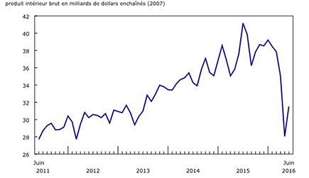 Après avoir enregistré des baisses au cours des quatre mois précédents, le secteur de l’extraction minière, de l’exploitation en carrière et de l’extraction de pétrole et de gaz a augmenté de 3,6 % en juin. Cette hausse est principalement attribuable à une augmentation de 12 % de l’extraction de pétrole par des méthodes non classiques, la capacité s’étant rétablie graduellement à la suite des feux de forêt et de l’évacuation de Fort McMurray en mai. La production de l’industrie en juin a tout de même été bien en deçà de la moyenne des trois dernières années.
