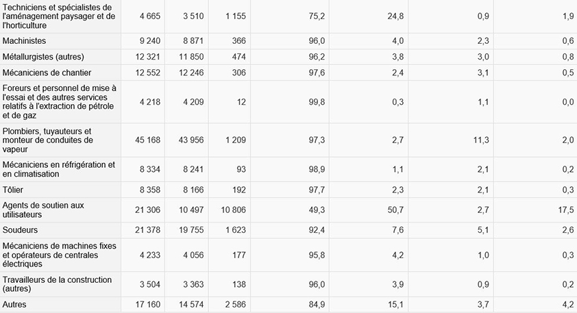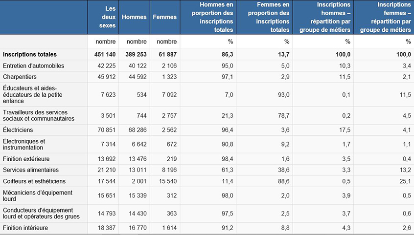 Les hommes représentaient plus de 90 % des inscriptions dans 18 des 25 grands groupes de métiers. Les femmes représentaient la majorité des inscriptions dans 4 grands groupes de métiers, à savoir les éducatrices et aides-éducatrices de la petite enfance (93,0 %), les coiffeuses et esthéticiennes (88,6 %), les travailleuses des services sociaux et communautaires (78,7 %) et les agentes de soutien aux utilisateurs (50,7 %). Le grand groupe de métiers d’agents de soutien aux utilisateurs comprend les adjoints au soutien en technologie de l’information et les techniciens du matériel informatique.