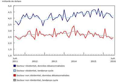 Les intentions de construction de logements multifamiliaux ont légèrement diminué de 0,4 % pour se situer à 1,7 milliard de dollars en juillet. Il s’agit du cinquième recul mensuel depuis le début de 2016. La valeur des permis a fléchi dans quatre provinces, la Colombie-Britannique et le Québec enregistrant les baisses les plus fortes.