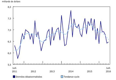 En juillet, la valeur des permis de bâtir délivrés par les municipalités s’est établie à 6,5 milliards de dollars, en hausse de 0,8 % par rapport au mois précédent. Cette croissance découle en grande partie de l’augmentation des intentions de construction d’immeubles à vocation institutionnelle et industrielle. L’Ontario et l’Alberta étaient à la tête de la progression nationale.