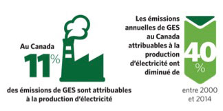 Le secteur de l’électricité compte pour 11 % des émissions de gaz à effet de serre (GES) au Canada. Ces émissions ont régressé de 40 % entre 2000 et 2014, une situation principalement attribuable à l’abandon graduel des centrales au charbon en Ontario de même qu’à des initiatives visant à réduire les GES lancées en Nouvelle-Écosse et au Nouveau-Brunswick.