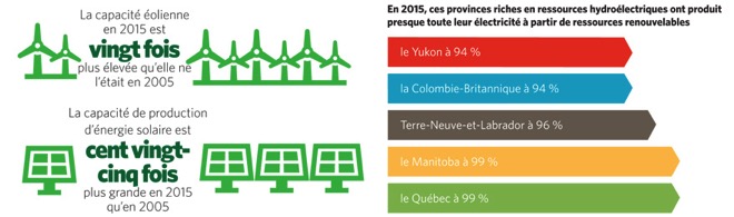 Les gains les plus appréciables au cours des dix dernières années ont été enregistrés en Ontario et en Nouvelle-Écosse où la production d’énergie renouvelable est passée respectivement de 23 % à 34 % et de 12 % à 24 %.