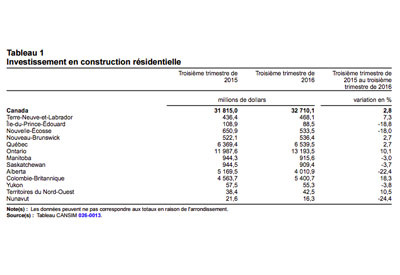 Investissement en construction résidentielle, troisième trimestre de 2016