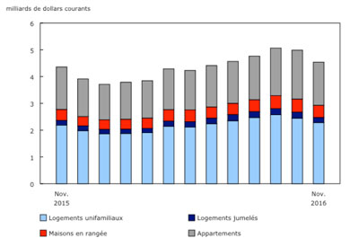 L’investissement dans la construction résidentielle neuve s’est chiffré à 4,5 milliards de dollars en novembre. Il s’agit d’une hausse de 4,1 % par rapport à novembre 2015. À l’échelle nationale, l’accroissement de l’investissement dans tous les types de logement est à l’origine d’une deuxième augmentation mensuelle consécutive.