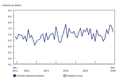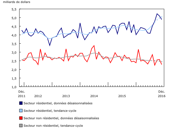 La valeur des permis de bâtir s’est chiffrée à 84,5 milliards de dollars en 2016, ce qui représente une baisse de 0,8 % par rapport à l’année précédente. Il s’agit d’une cinquième année consécutive où les intentions de construction ont été plus élevées que 80 milliards de dollars. Des baisses ont été enregistrées dans quatre provinces, la plus prononcée étant celle observée en Alberta. Les intentions de construction se sont affaiblies dans le secteur non résidentiel, alors qu’elles se sont accrues dans le secteur résidentiel pour atteindre un niveau record.