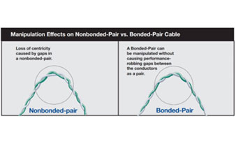 La technologie des paires liées résout les défis de résistance associés au câblage à paire non liée. Même lorsque des contraintes sont appliquées au câblage – que ce soit par traction, enroulement, flexion, entortillement ou torsion – les propriétés électriques ne se dégradent pas au fil du temps. Même quand le câblage à paire liée est réutilisé pendant les déplacements, les ajouts et les modifications (MAC) ou constamment enroulé et déroulé, il maintient le même niveau de performance. Lorsque le câblage à paire liée transmet des données à partir de n’importe quel périphérique IoT, vous n’aurez pas à vous préoccuper de la dégradation due au fil du temps ou à la réutilisation.
