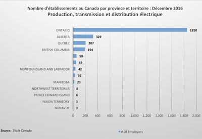 L’Ontario est la province canadienne qui compte le plus d’établissements de production, transmission et distribution électrique.