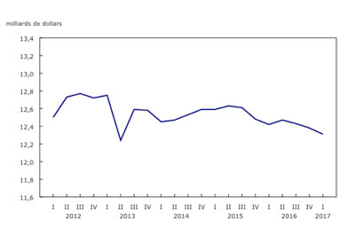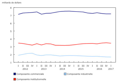 L’investissement en construction de bâtiments non résidentiels s’est chiffré à 12,3 milliards de dollars au premier trimestre de 2017, en baisse de 0,5 % par rapport au trimestre précédent. Il s’agit d’un sixième recul en sept trimestres. À l’échelle nationale, cette diminution reflète en grande partie la réduction des dépenses en construction d’immeubles institutionnels et, dans une moindre mesure, en construction de bâtiments industriels.