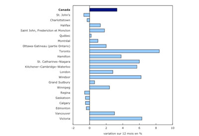 L’IPLN a connu une augmentation de 3,3 % au cours de la période de 12 mois se terminant en mars, ce qui est en grande partie attribuable aux prix plus élevés des logements neufs à Toronto (+8,4 %). D’autres hausses notables d’une année à l’autre ont été déclarées à Victoria (+6,3 %), à Windsor (+6,2 %), et à St. Catharines-Niagara (+6,0 %).