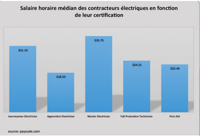 Salaire horaire médian des contracteurs électriques en fonction de leur certification.