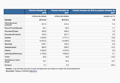 La valeur totale des investissements en construction résidentielle s’est chiffrée à 28,2 milliards de dollars au premier trimestre, ce qui représente une augmentation de 7,6 % par rapport au premier trimestre de 2016.