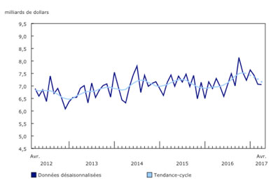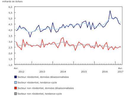En avril, la valeur des permis de construction résidentielle délivrés par les municipalités canadiennes a fléchi de 2,5 % pour s’établir à 4,5 milliards de dollars, ce qui représente une troisième baisse mensuelle consécutive. La diminution des intentions de construction de logements unifamiliaux a plus que contrebalancé l’augmentation modérée de la composante des logements multifamiliaux. Trois provinces ont affiché des reculs dans le secteur résidentiel en avril, l’Ontario venant en tête.