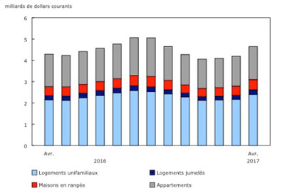 En avril, les dépenses en construction de logements jumelés ont augmenté dans sept provinces pour se chiffrer à 218,1 millions de dollars, ce qui représente une hausse de 13,2 % par rapport à avril 2016. L’Alberta (+12,9 millions de dollars) a affiché l’augmentation la plus prononcée d’une année à l’autre, tandis que la Colombie-Britannique, le Québec et le Manitoba ont inscrit de légers reculs pour ce type de logements.
