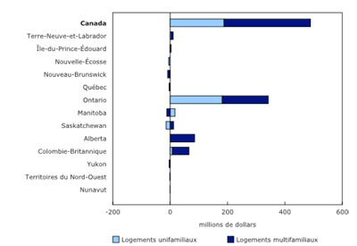 La composante des logements multifamiliaux a affiché une hausse de 15,0 % en mai pour atteindre 2,3 milliards de dollars, après une croissance de 6,9 % en avril. Un accroissement des intentions de construction a été observé pour chaque type de logements multifamiliaux, en particulier les maisons en rangée. Par ailleurs, la valeur des permis de construction de logements unifamiliaux a augmenté de 7,4 % pour s’établir à 2,7 milliards de dollars en mai, ce qui est surtout attribuable aux maisons unifamiliales en Ontario.