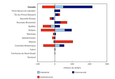 En Ontario, la croissance enregistrée en mai est surtout attribuable au secteur résidentiel, alors que les composantes des logements multifamiliaux et des logements unifamiliaux étaient en progression dans la RMR de Toronto. De plus, la composante industrielle en Ontario a connu une troisième augmentation mensuelle d’affilée, alors que la croissance en mai découlait surtout de la hausse des intentions de construction de bâtiments rattachés à l’entretien dans la RMR de Hamilton. Enfin, la composante commerciale, plus précisément la catégorie des hôtels et des restaurants, a mené l’augmentation de la valeur totale des permis de bâtir dans la partie ontarienne de la RMR d’Ottawa–Gatineau en mai.