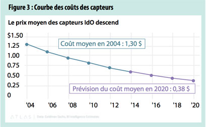 Cette tendance de déploiement de capteurs couplés aux systèmes d’éclairage et de commande continuera grâce à la forte demande de données opérationnelles et d’applications de commandes de capteurs et de commutateurs que les appareils mobiles peuvent offrir et les prix à la baisse des capteurs (voir la courbe des coûts à la Figure 3).