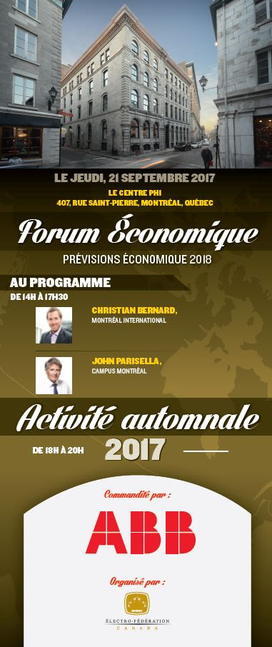 L’ÉFC et ABB vous invitent au forum économique le jeudi 21 septembre 2017 au Centre Phi. Venez écouter Christian Bernard et John Parisella faire part de leurs prévisions pour 2018.