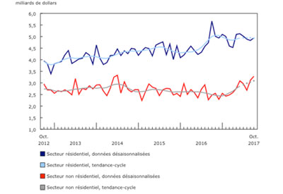 Dans le secteur non résidentiel, la valeur des permis de bâtir s’est accrue de 171,7 millions de dollars en octobre pour s’établir à 3,3 milliards de dollars, ce qui représente une deuxième hausse mensuelle consécutive.