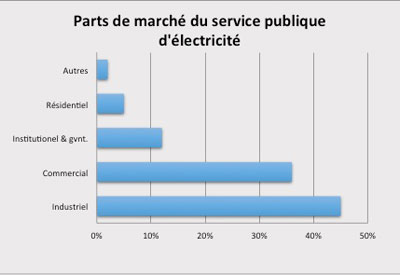 Le marché des services publiques d’électricité est composé principalement des secteurs industriels et commerciaux qui accaparent 81% des parts de marché combinés. Le secteur résidentiel arrive en troisième avec seulement 5% des parts.