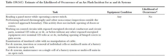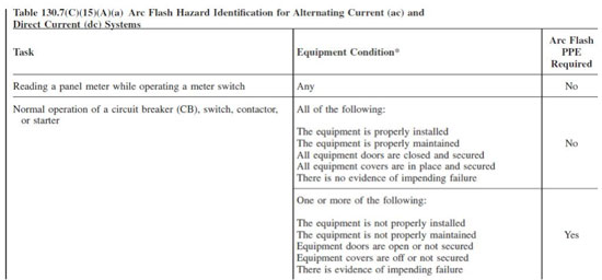 Le nouveau tableau est utile, mais ne peut pas se substituer à l’expérience ou au savoir-faire. Il faut donc l’utiliser avec prudence. La personne devant l’appareillage qui s’apprête à effectuer une tâche doit déterminer sa pertinence et évaluer sa condition, notamment l’état de son entretien, avant d’accomplir cette tâche. L’emploi de ce tableau est « permis »; autrement dit, il s’agit d’une option—il peut être utilisé mais n’est pas obligatoire. À la fin du tableau 130.5(C) il est dit que pour utiliser le tableau, l’appareillage doit être en condition normale de fonctionnement :