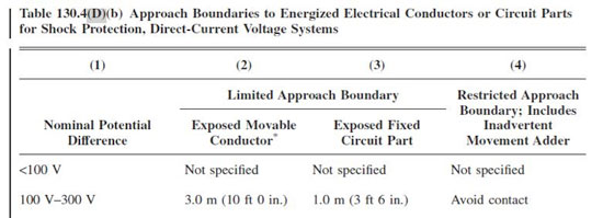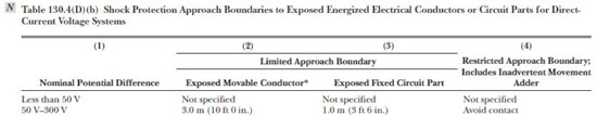 Le seuil de choc pour les tensions c.a. et c.c. est de nouveau de 50 V pour se conformer aux règlements de l’OSHA. Cela est fondé sur une section de l’avant-propos de la norme 70E qui stipule : « Le comité élaborerait une norme pour les installations électriques qui serait compatible avec les exigences de l’OSHA en matière de sécurité des employés ….”