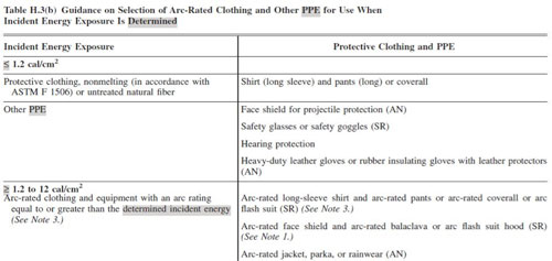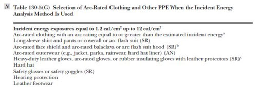 SI les vêtements anti-arc et autres ÉPI doivent être sélectionnés au moyen d’étiquettes d’avertissement contre les éclairs d’arc, le tableau 130.5(G) peut être utilisé pour faciliter le choix de ces équipements. Les utilisateurs sont prévenus de ne pas mélanger la Méthode du tableau à la Méthodes d’analyse des incidents énergétiques pour sélectionner leurs vêtements anti-arc et leurs ÉPI. Les deux méthodes sont incompatibles, ce qui pourrait entraîner des problèmes. La méthode du tableau est utilisée lors de l’évaluation du courant de défaut disponible et le temps de fonctionnement du dispositif de protection contre les surintensités (OCPD). Le tableau 130.5(G) est employé lorsque des étiquettes d’avertissement contre les éclairs d’arc y sont apposées.