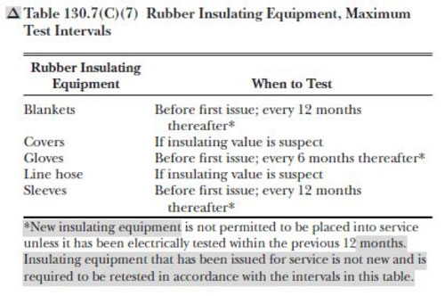 La note de bas de page du tableau de l’édition précédente n’est pas claire. Même les représentants de l’OSHA et de l’ASTM ne partageaient pas la même opinion. Toutefois, le comité du NFPA 70E ainsi que les représentant de l’OSHA et de l’ASTM ont convenu que les gants isolés en caoutchouc ne devraient pas être inutilisés plus de 12 mois avant d’être testés de nouveau. D’après le représentant de l’OSHA, les gants sont considérés être mis en service au moment de leur achat et non quand ils sont distribués. Il a également fait remarquer que ces gants isolés en caoutchouc sont testés lors de leur fabrication, mais pourraient rester inutilisés jusqu’à deux ans avant d’être enfin achetés. Voilà pourquoi le comité a décidé de modifier la note de bas de page afin de la rendre plus compréhensible (voir la figure 6).
