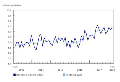 ecob1_400.jpgAu premier trimestre de 2018, la valeur des permis de bâtir délivrés par les municipalités canadiennes s’est établie à 24,9 milliards de dollars, en hausse de 3,3 % par rapport au quatrième trimestre de 2017.