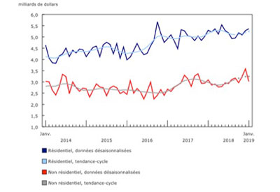 Dans le secteur résidentiel, la valeur des permis de bâtir délivrés par les municipalités a diminué de 4,3 % pour s’établir à 5,1 milliards de dollars en avril. Cinq provinces ont affiché des baisses, la Colombie-Britannique ayant enregistré la baisse la plus prononcée.