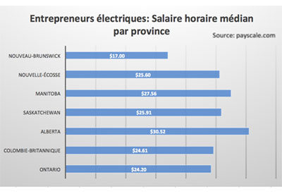 Entrepreneurs électriques: salaire horaire médian par province