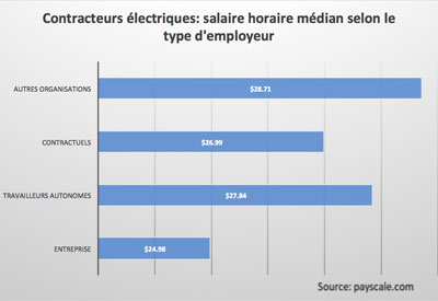 Contracteurs électriques: salaire horaire médian selon le type d’employeur