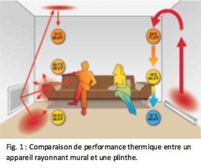 Rayonnement direct et diffus : Pour qu’un appareil de chauffage rayonnant puisse apporter le plus grand confort possible, il est préférable qu’il puisse offrir à son utilisateur du rayonnement direct ainsi que du diffus. Autrement dit, il faut éviter autant que possible qu’il soit bloqué par d’autres objets pouvant limiter son rayonnement direct. Un emplacement propice pour ces appareils rayonnants est directement au mur.