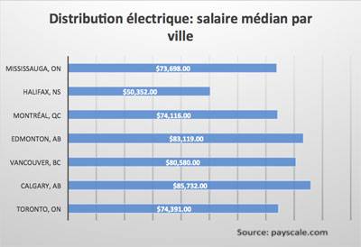 C’est en Alberta que les employés de distribution électrique ont le salaire médian le plus élevé, avec Calgary et Edmonton affichant les deux plus hauts salaires médians au pays.