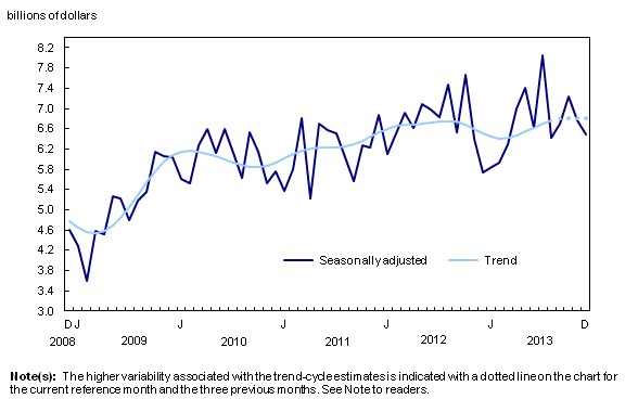 Les intentions de construction de logements multifamiliaux ont reculé de 21,9 % en décembre pour se fixer à 1,5 milliard de dollars, à la suite d’une baisse de 8,4 % en novembre. La majeure partie de la baisse observée provient de la Colombie-Britannique, de l’Ontario et de l’Alberta. En dépit des diminutions notées en décembre, ces trois provinces ont enregistré de fortes hausses de la valeur des permis de construction de logements multifamiliaux en 2013 par rapport à l’année précédente.