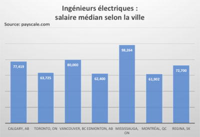 Les ingénieurs électriques qui travaillent à Mississauga en Ontario ont le salaire médian le plus élevé au Canada avec un revenu médian supérieur à 98 000$.